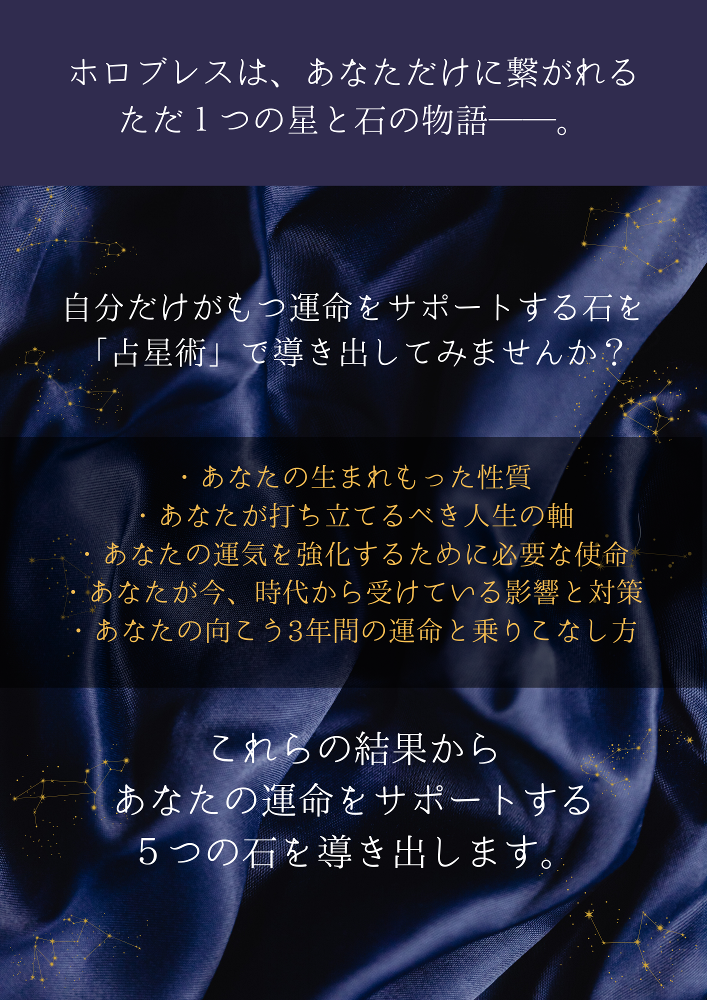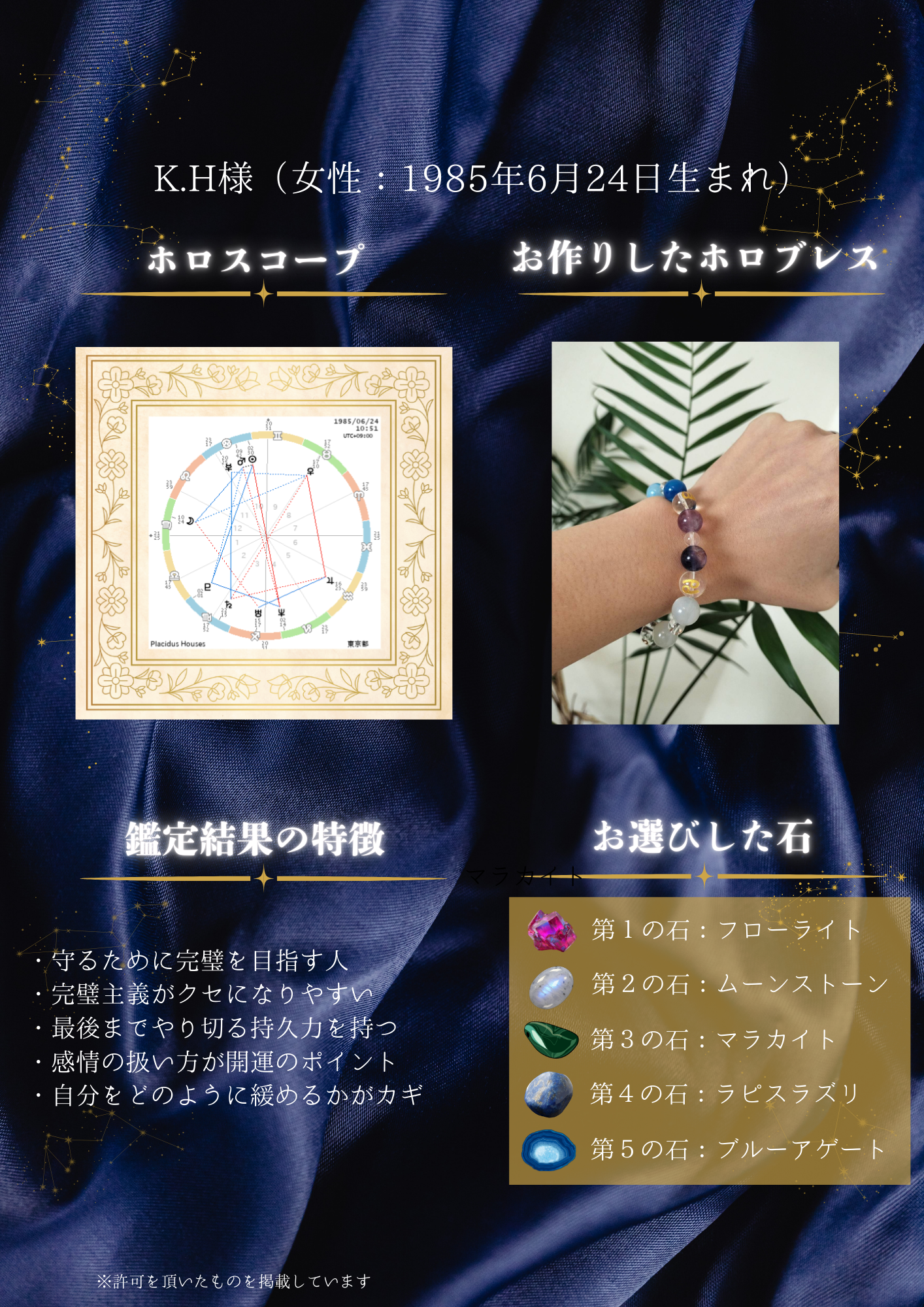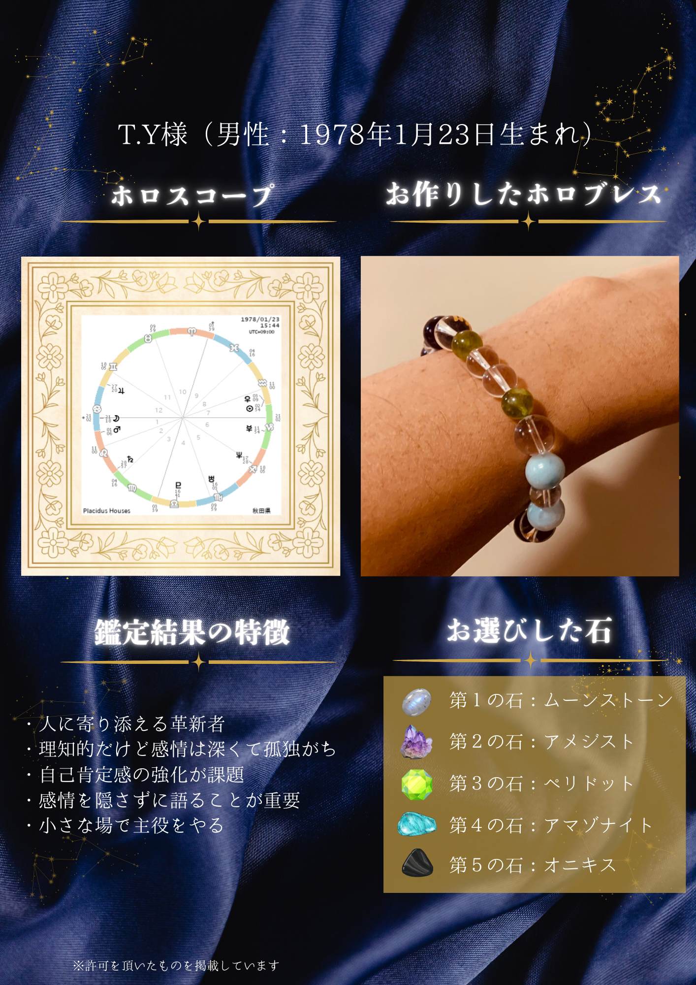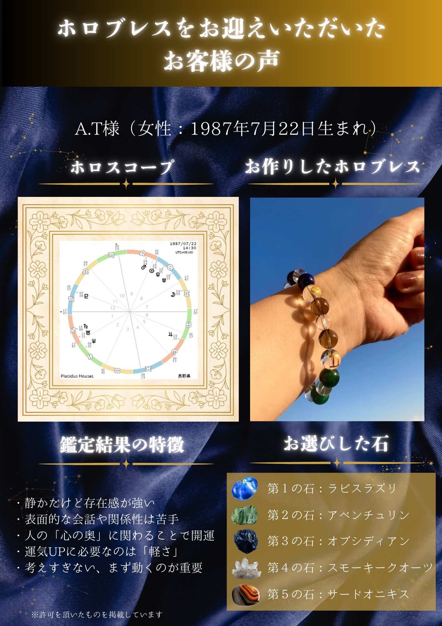 A.はい、占星術のホロスコープは実際に動いている天体なので、あなたに合う石は1~3年おきに変化していきます。あなたの星の巡りに合わせてホロブレスでは独自の鑑定メソッドに基づいた石をご提案しておりますので、ご購入後もお気軽にご相談ください。