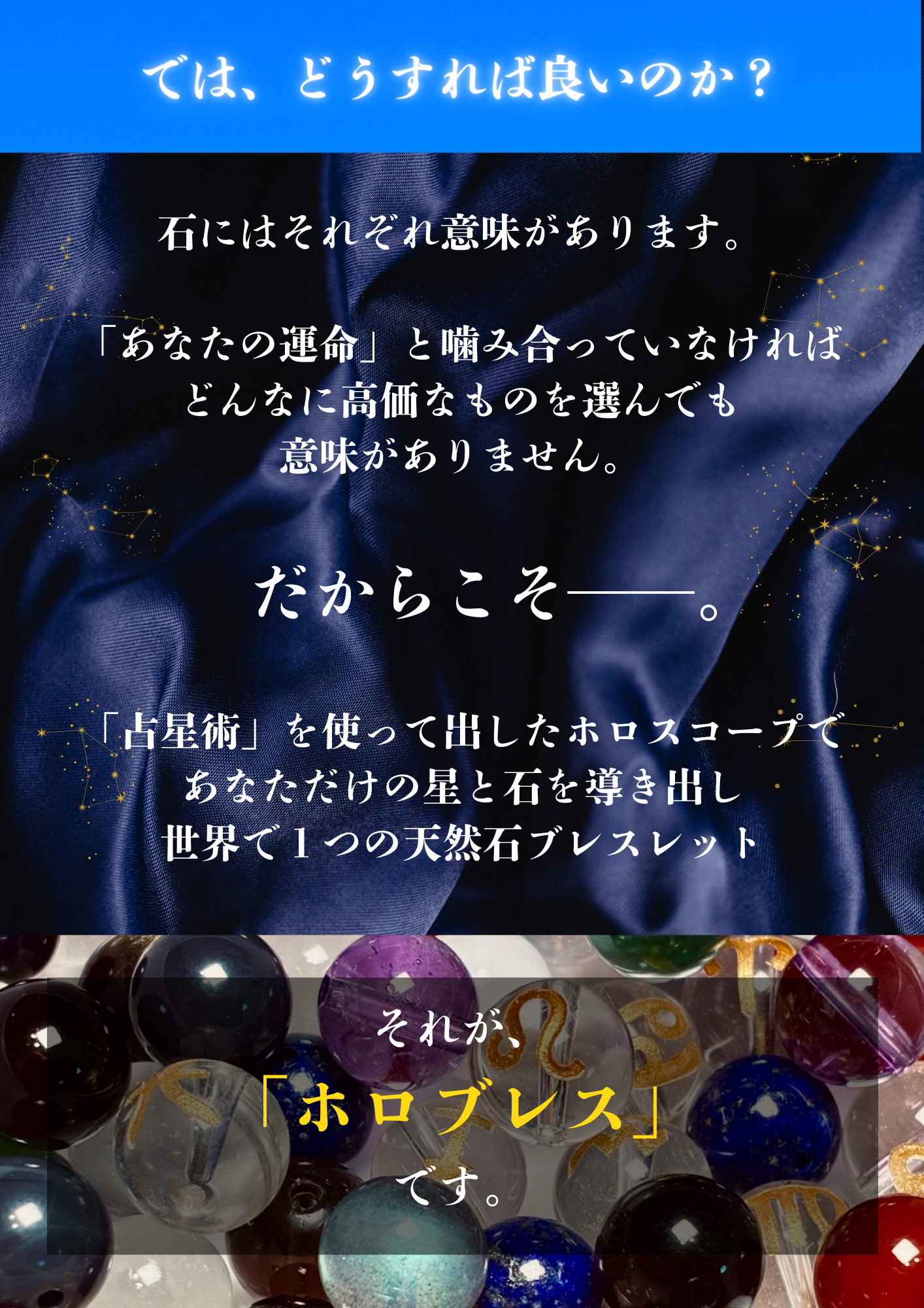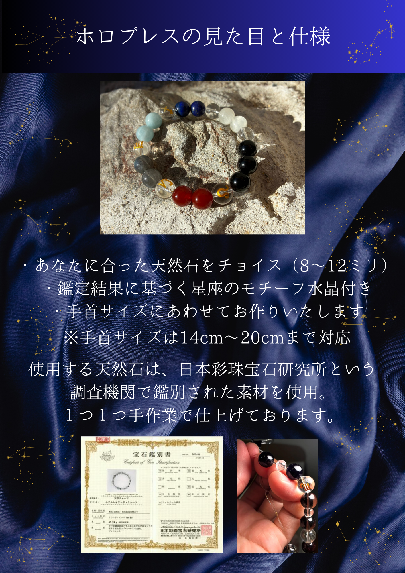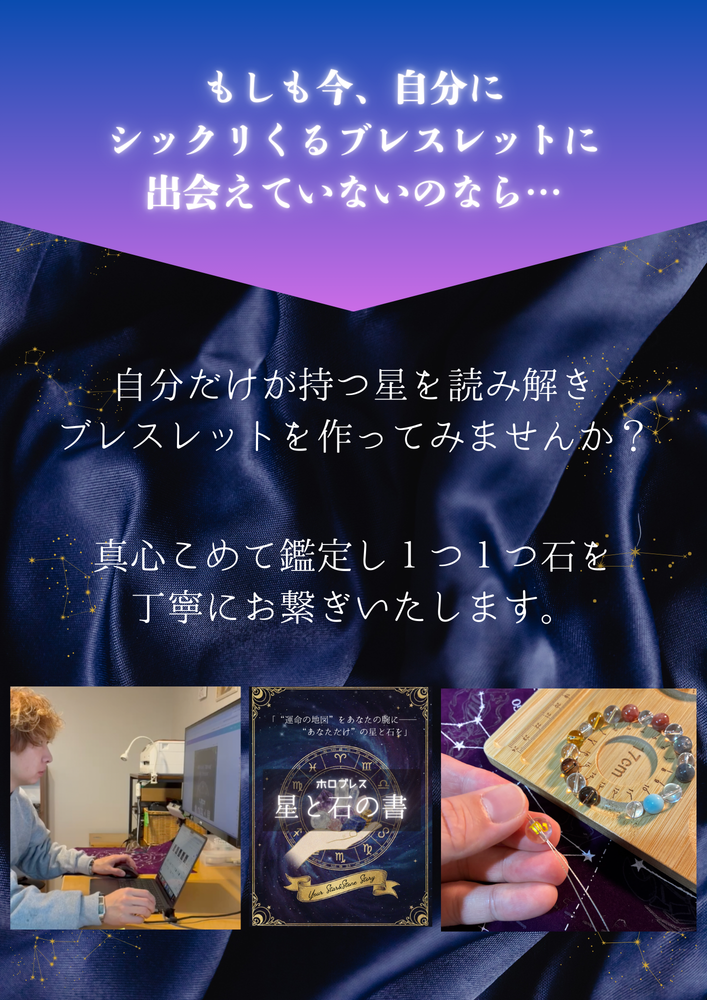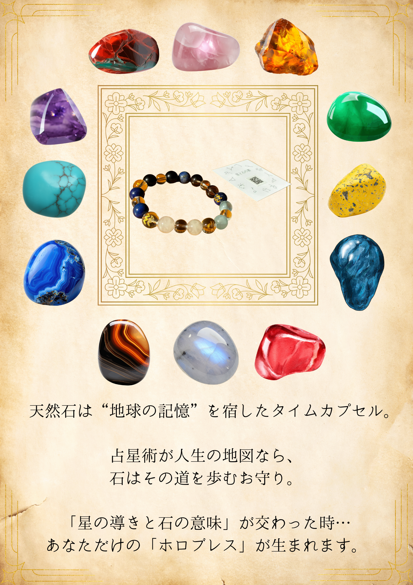 A. その不安な気持ち、よく分かります。ですが、ご安心ください。 ホロブレスは、私の好みや世間の流行で石を選ぶのではなく、あなたの生年月日という「変えられない運命の設計図」に基づいて選定します。 不思議なことに、星に従って選ばれた石は、その方の雰囲気に驚くほどしっくり馴染むものです。「自分では選ばなかったけれど、手に取ってみたらこれが一番落ち着く」という体験こそが、自分の新しい一面を受け入れる第一歩になります。私を信じて、楽しみにお待ちいただければ幸いです。