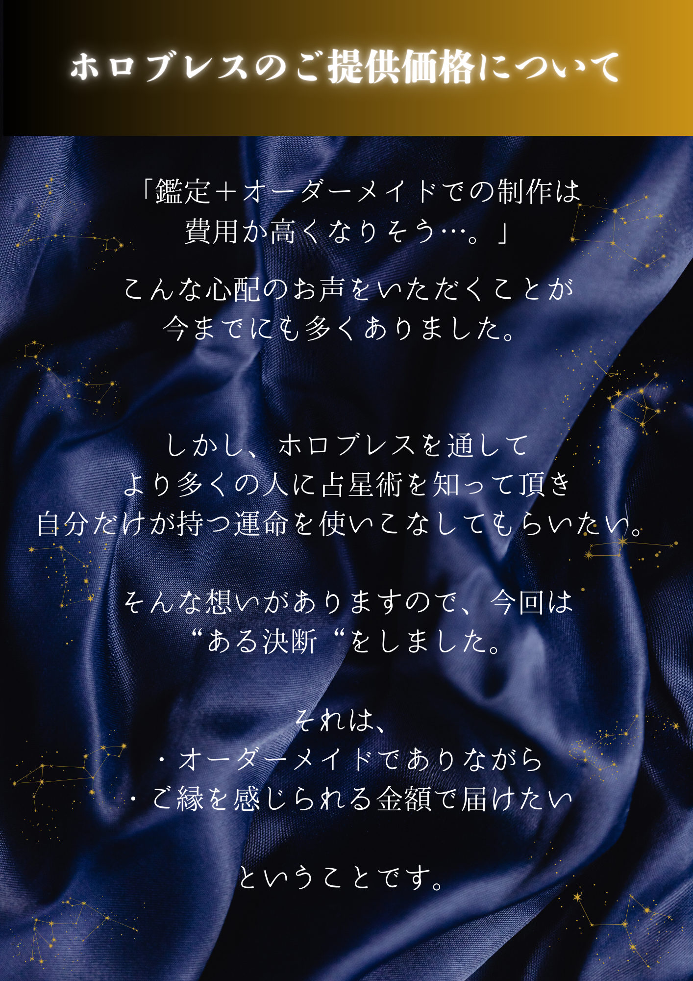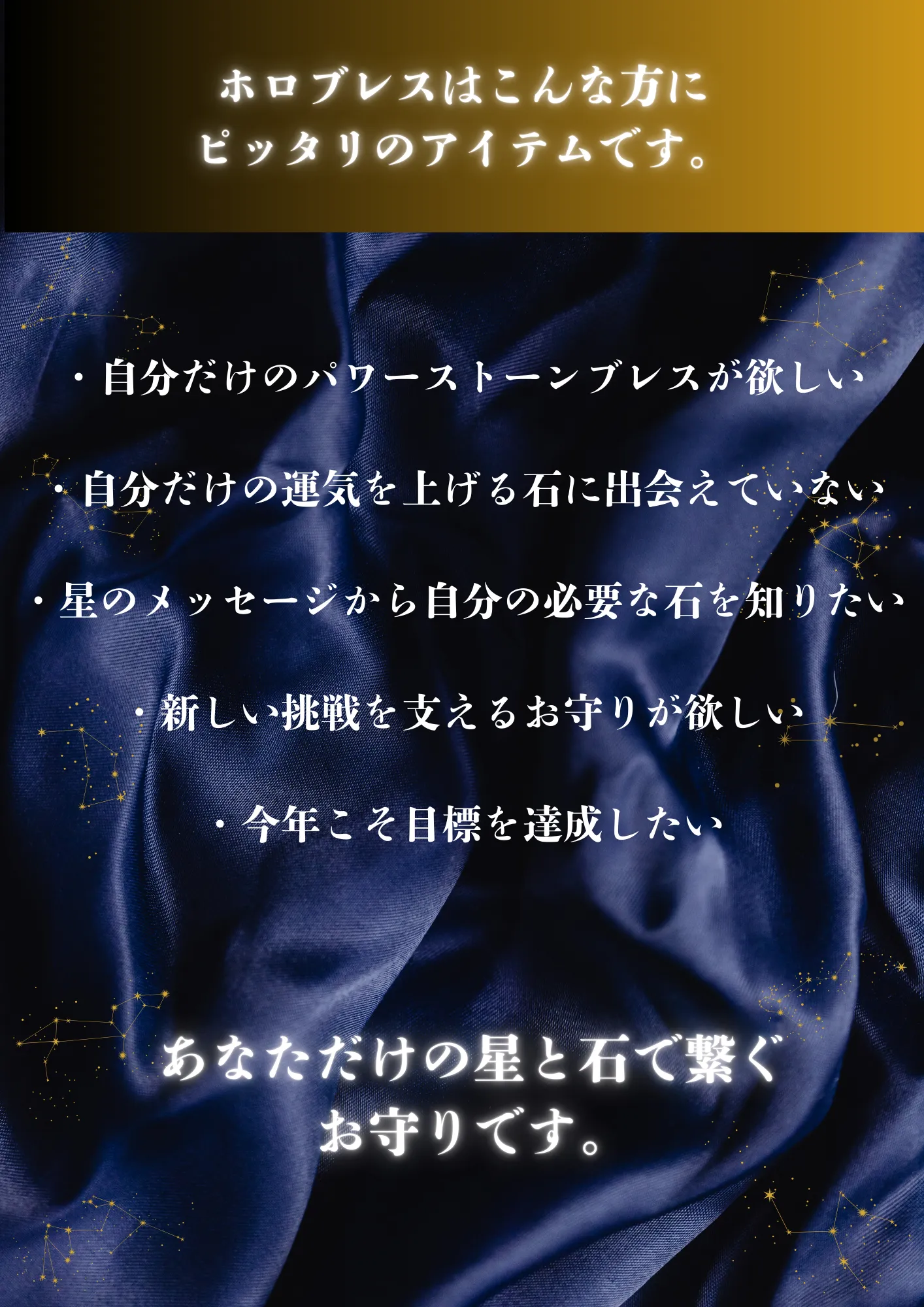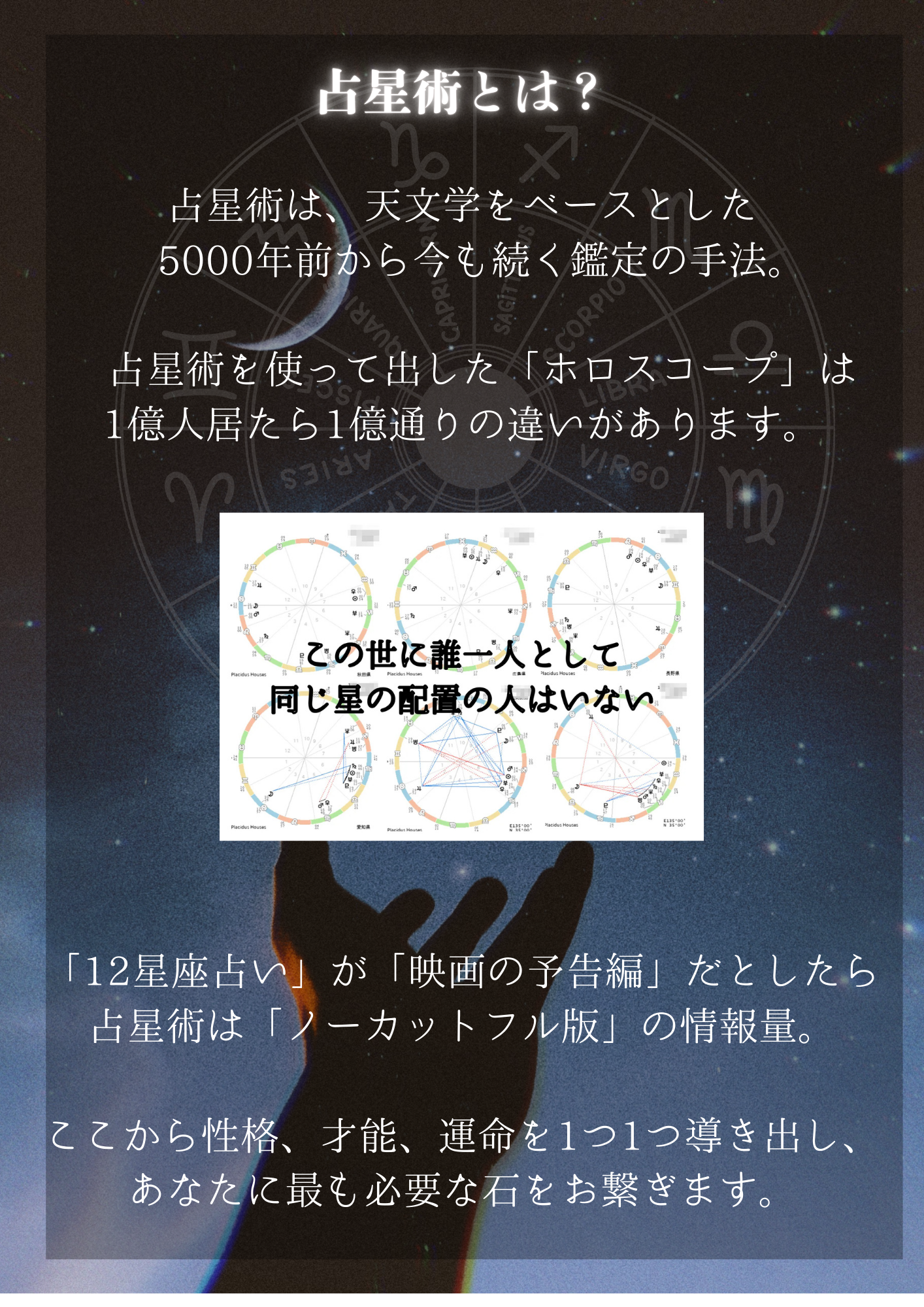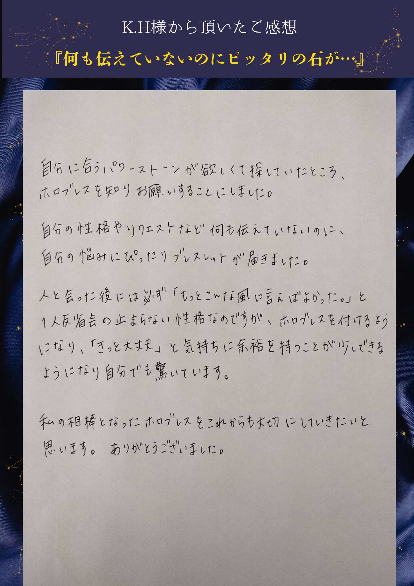 A. その不安な気持ち、よく分かります。ですが、ご安心ください。 ホロブレスは、私の好みや世間の流行で石を選ぶのではなく、あなたの生年月日という「変えられない運命の設計図」に基づいて選定します。 不思議なことに、星に従って選ばれた石は、その方の雰囲気に驚くほどしっくり馴染むものです。「自分では選ばなかったけれど、手に取ってみたらこれが一番落ち着く」という体験こそが、自分の新しい一面を受け入れる第一歩になります。私を信じて、楽しみにお待ちいただければ幸いです。