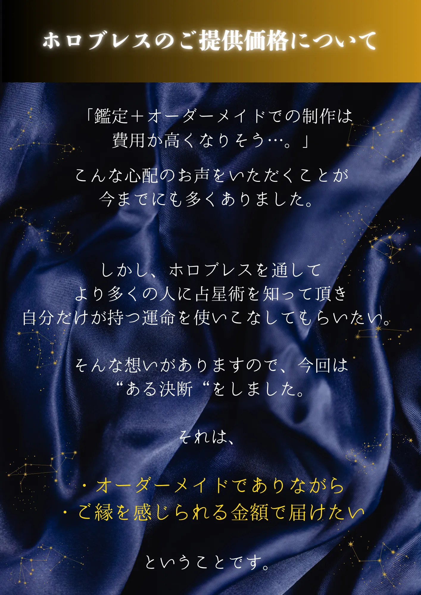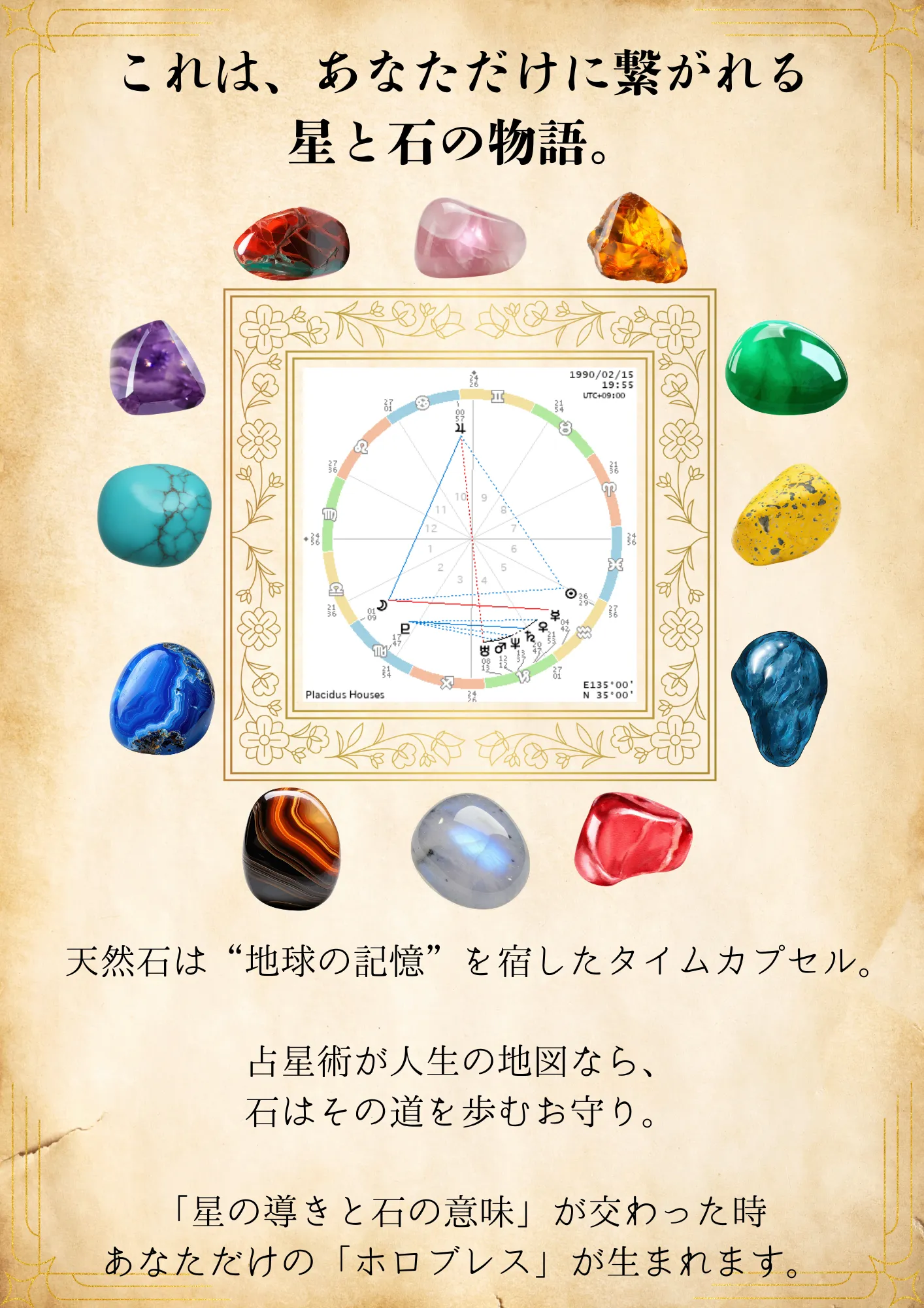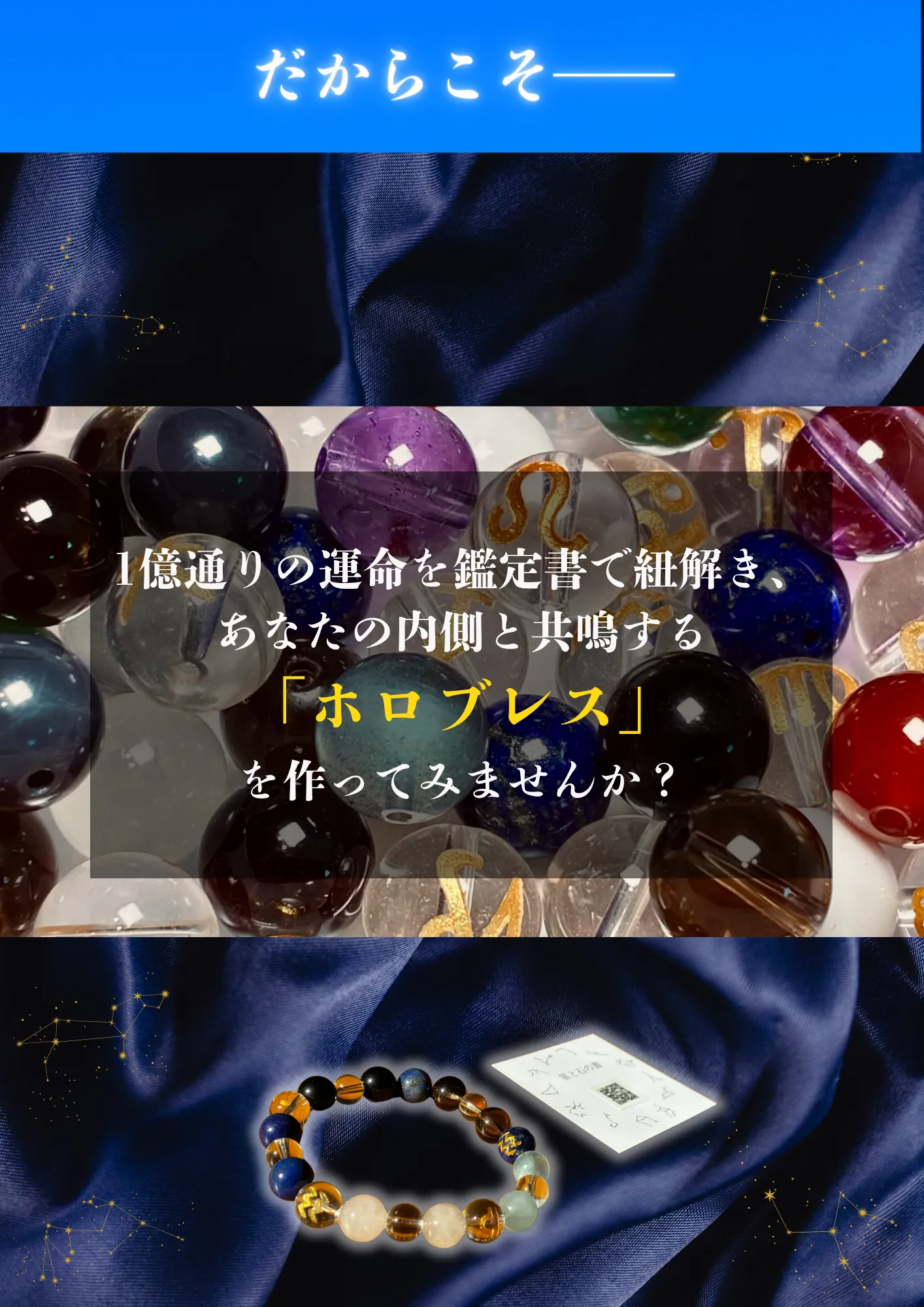 A. その不安な気持ち、よく分かります。ですが、ご安心ください。 ホロブレスは、私の好みや世間の流行で石を選ぶのではなく、あなたの生年月日という「変えられない運命の設計図」に基づいて選定します。 不思議なことに、星に従って選ばれた石は、その方の雰囲気に驚くほどしっくり馴染む声もお客様より頂いております。「自分では選ばなかったけれど、手に取ってみたらこれが一番落ち着く」という体験こそが、自分の新しい一面を受け入れる第一歩になります。新鮮な体験をお楽しみください。