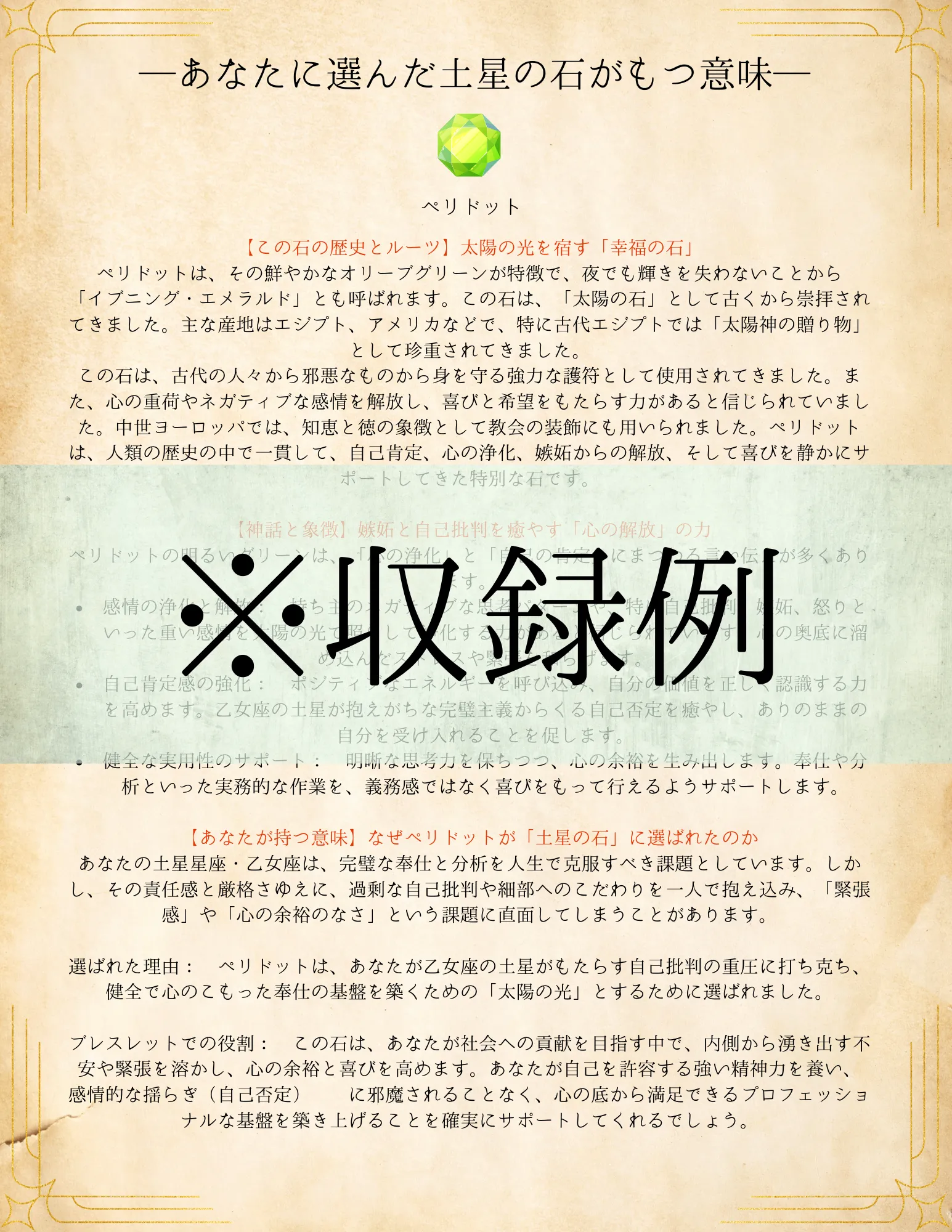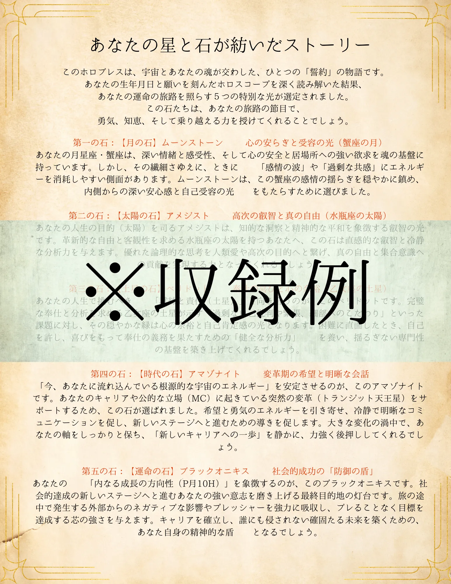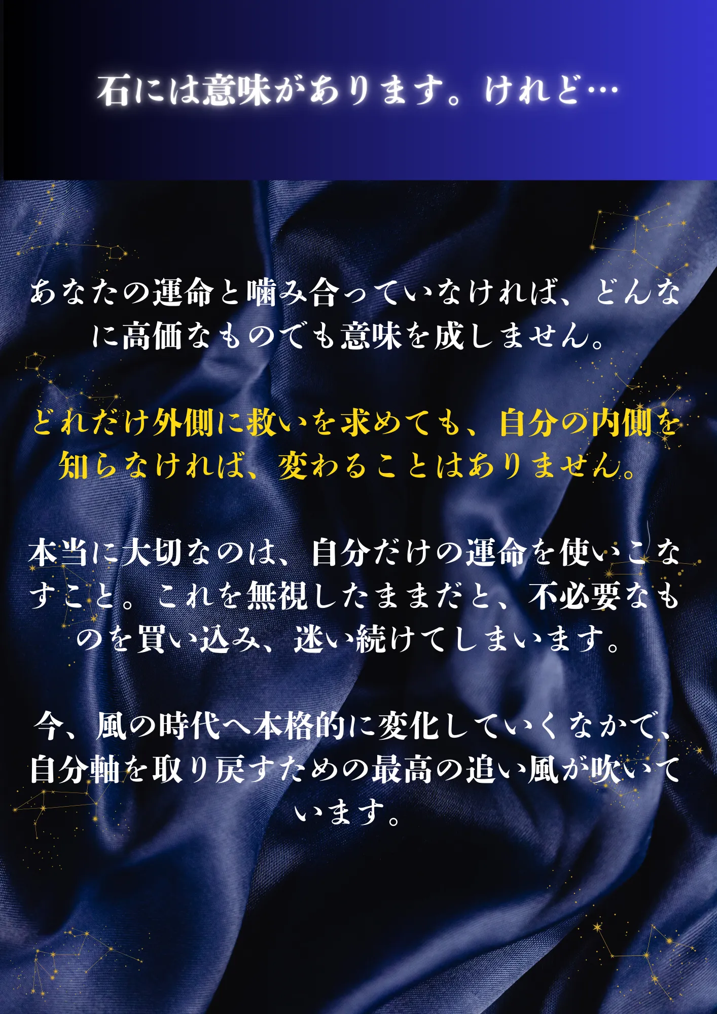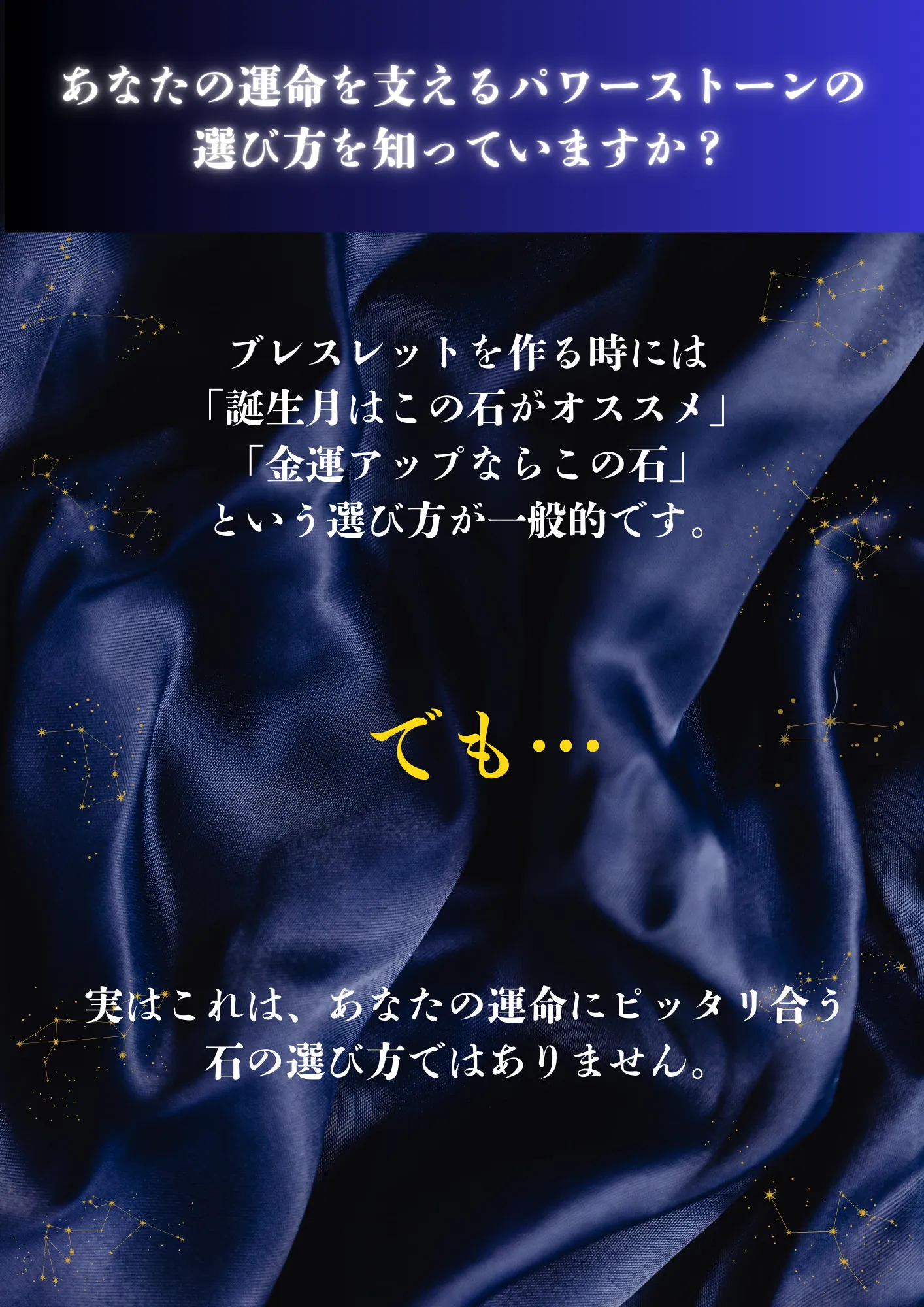 A. その不安な気持ち、よく分かります。ですが、ご安心ください。 ホロブレスは、私の好みや世間の流行で石を選ぶのではなく、あなたの生年月日という「変えられない運命の設計図」に基づいて選定します。 不思議なことに、星に従って選ばれた石は、その方の雰囲気に驚くほどしっくり馴染む声もお客様より頂いております。「自分では選ばなかったけれど、手に取ってみたらこれが一番落ち着く」という体験こそが、自分の新しい一面を受け入れる第一歩になります。新鮮な体験をお楽しみください。