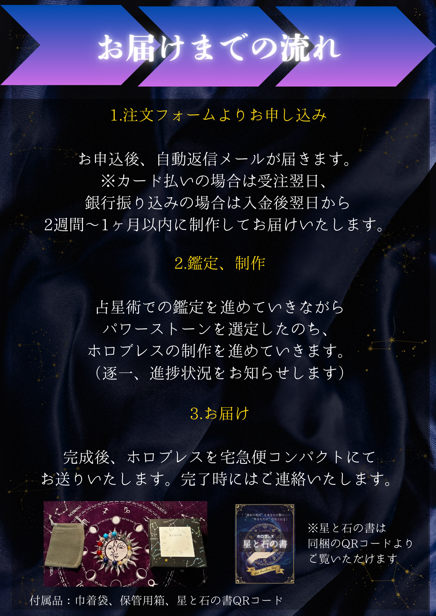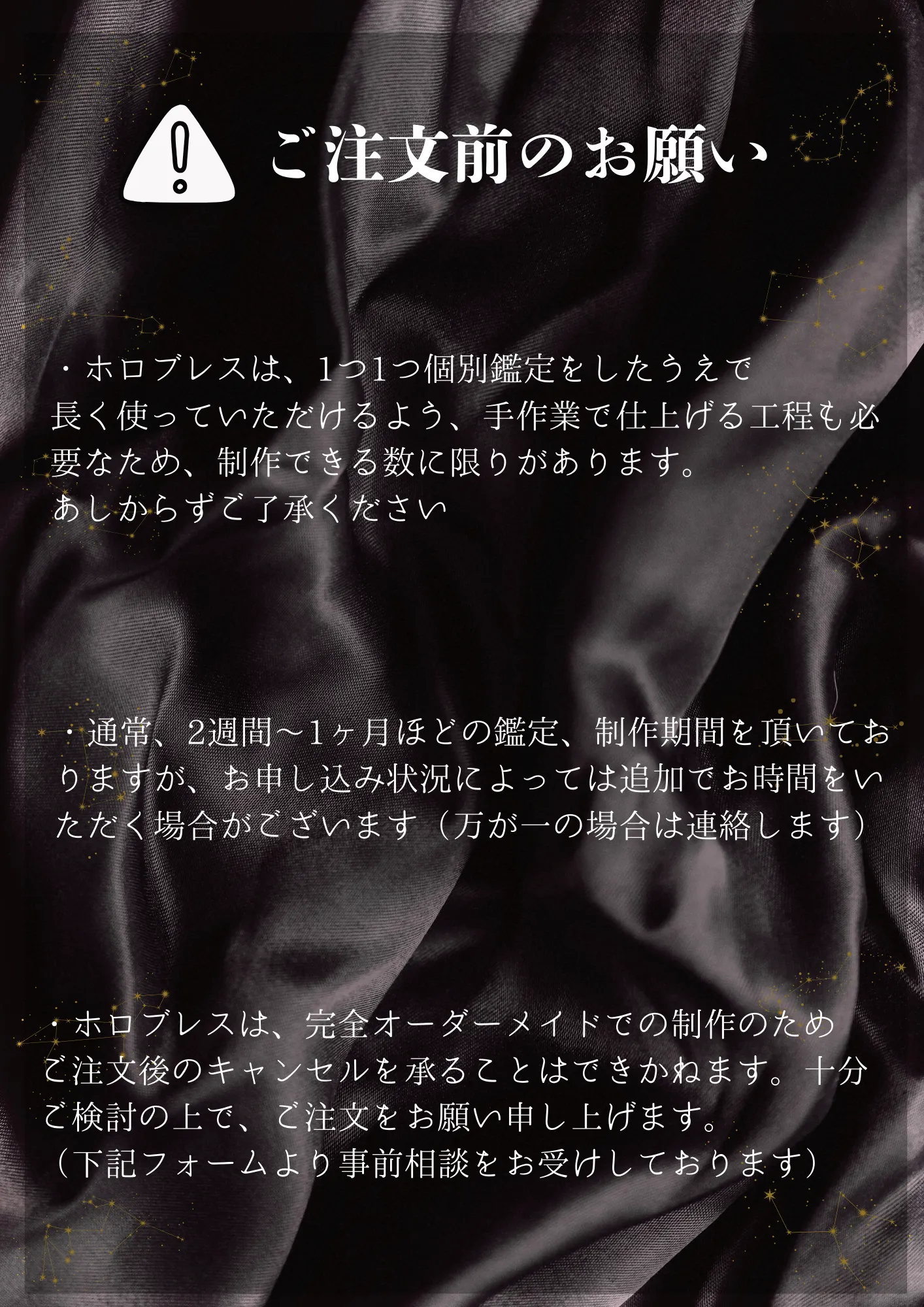 A. ご注文から制作・発送まで、通常2週間〜1ヶ月ほどいただいております。1点1点、鑑定と制作を丁寧に行っており、少々お時間をいただきますが、何卒ご了承ください。その代わり、ご注文いただいてからお届けの間までに、ホロブレスの世界を楽しんでいただけるメールをお送りしたり、制作の進捗状況などを逐一お送りいたしております。万が一プレゼントなどでお急ぎの場合は別途ご相談ください。